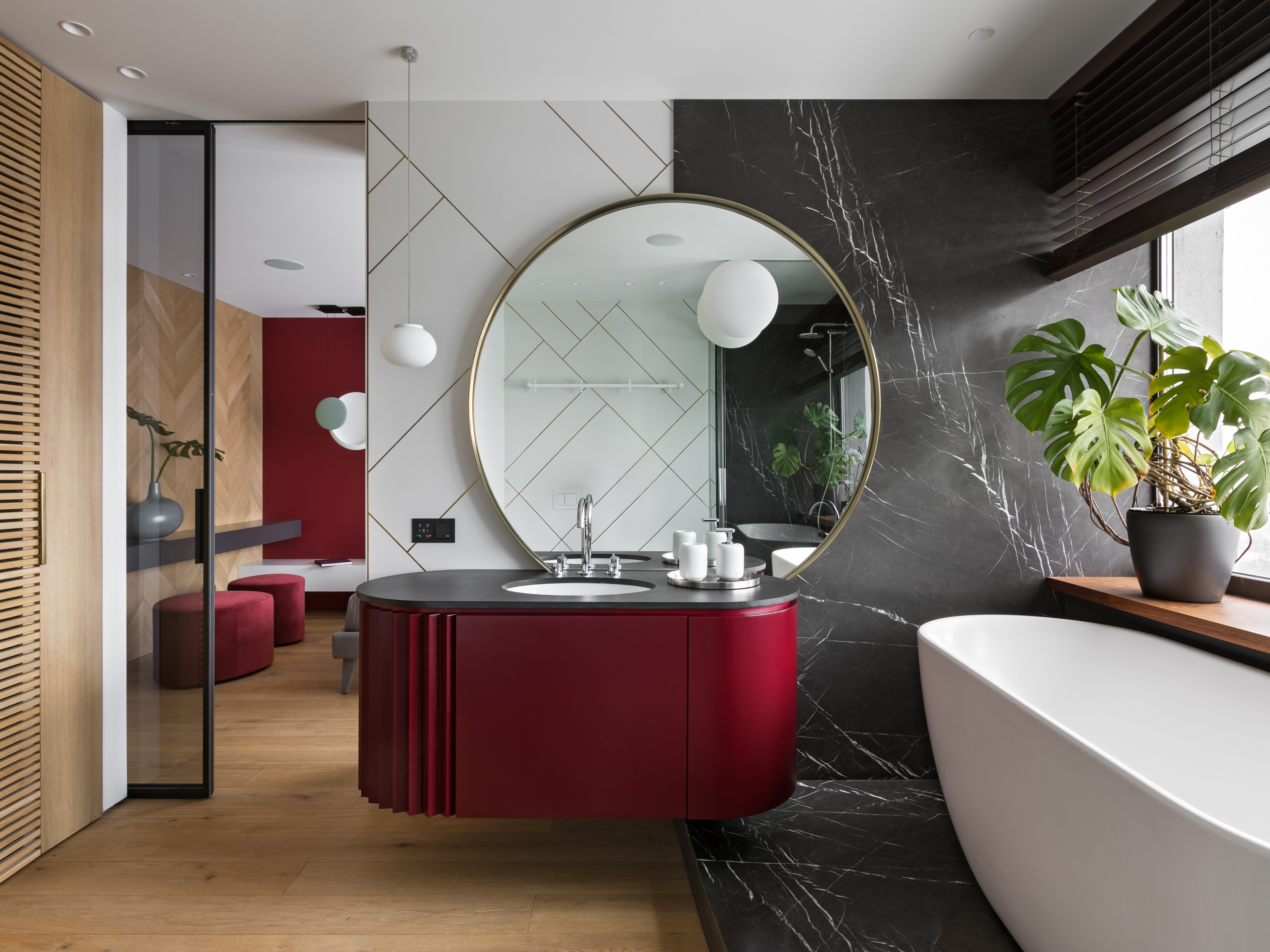 No banheiro, o elemento central é um espelho redondo sobre uma bancada da mesa cor da parede do quarto. Na área molhada, o mármore preto contrasta com a banheira, enquanto o resto do ambiente é coberto com um painel geométrico de azulejos brancos de corte personalizado com forro de latão.