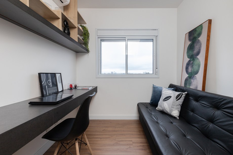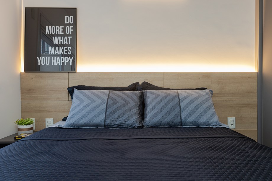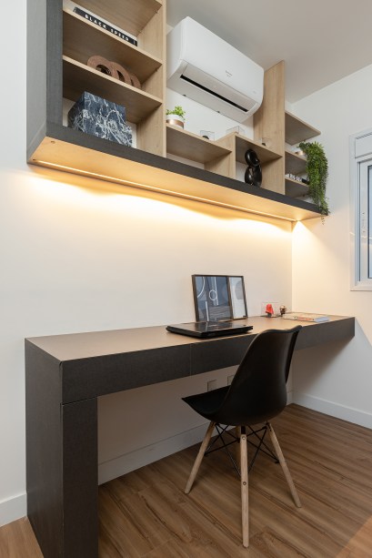 Nos dormitórios, o escritório manteve a configuração original com alguns toques que conferem elegância e modernidade, como armários cinzas e a cabeceira em tom de madeira. A iluminação indireta que permeia todo o apartamento também evidencia a possibilidade de criar diferentes cenários de acordo com a ocasião.