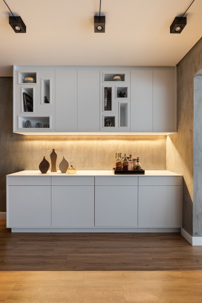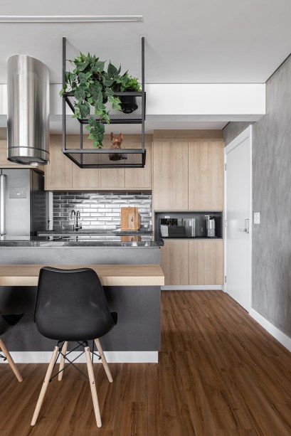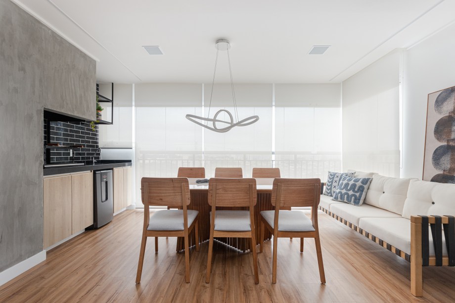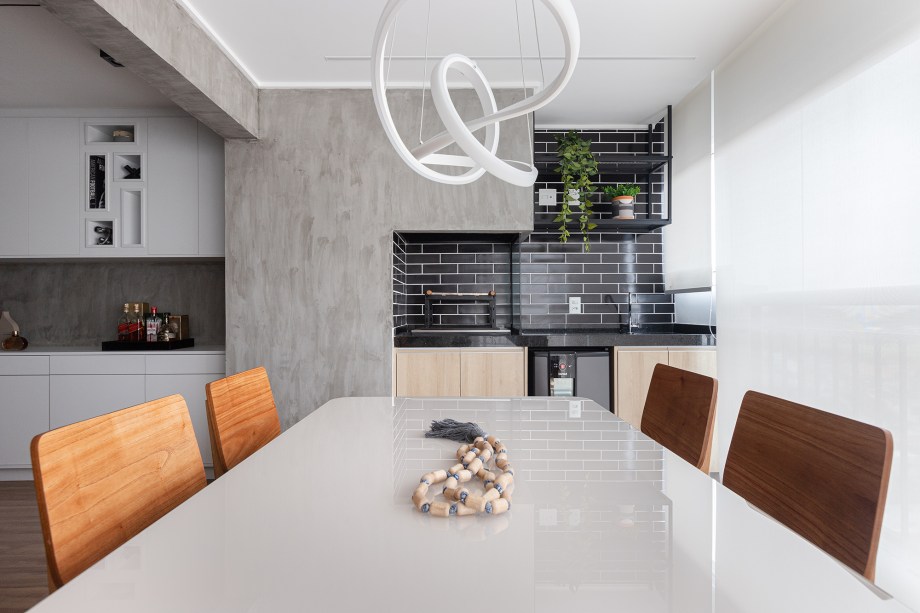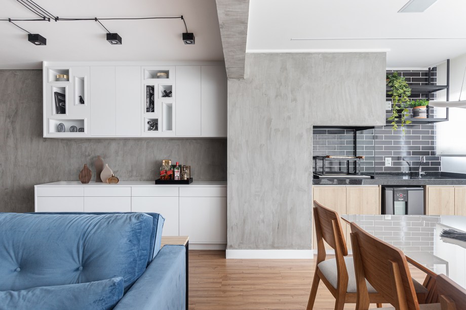No mesmo espaço, estão a sala de jantar com uma churrasqueira e um sofá, uma área para reunir os amigos, uma área voltada para bar e, por fim, a cozinha. O piso vinílico engloba todos os ambientes para dar ainda maior ênfase à integração. O cimento queimado nas paredes destaca o partido estético encontrado em todo o restante do apartamento e imprime a personalidade, os hobbies e a rotina do cliente.