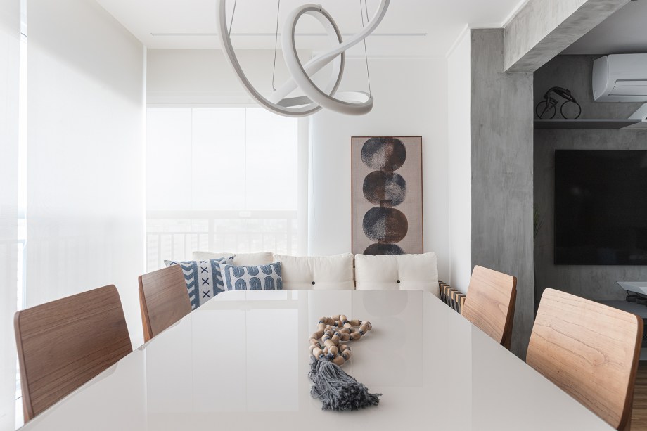 O cliente desejava que o novo lar fosse moderno e adequado à sua rotina e pediu por uma boa quantidade de armários na suíte principal e um home office que pudesse ser utilizado como dormitório em dias de visita. Para proporcionar maior fluidez e aproveitamento dos espaços, os arquitetos apostaram na integração dos três ambientes sociais – cozinha, sala e varanda -, flexibilizando o seu uso.