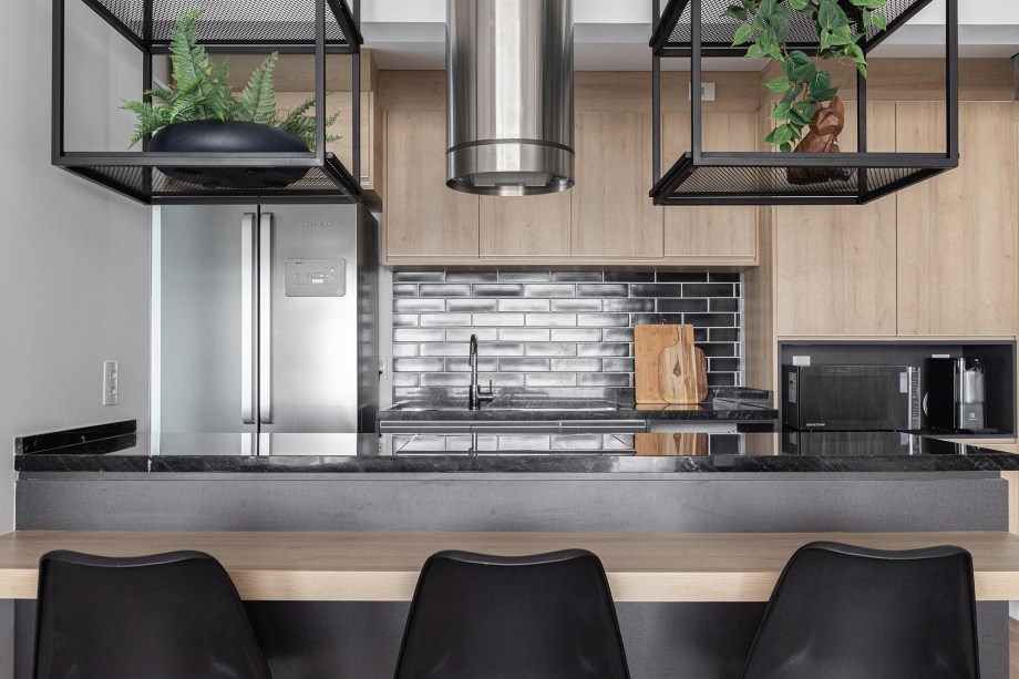 Em todo o projeto, foram utilizados tons sóbrios como o cinza, preto e os tons de madeira. Outros materiais como o metalon preto nas prateleiras sobre a bancada da cozinha, churrasqueira e em alguns móveis da sala, reforçam o objetivo de passar um ar moderno e masculino.