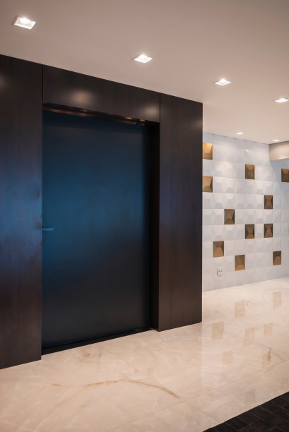 A entrada do apartamento conta com painéis integrados em tom amadeirado para trazer um toque de sofisticação. No hall, a porta foi trocada por uma pivotante com a tecnologia da biometria.