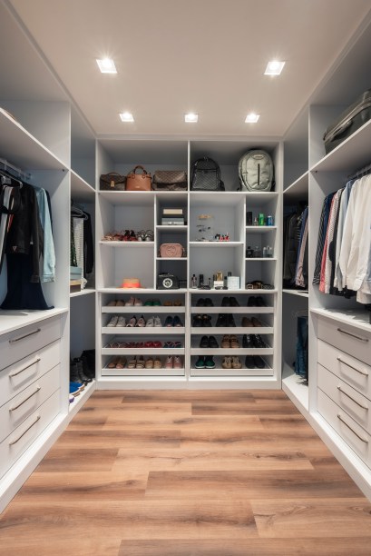 No banheiro do casal, a banheira spa protagoniza a cena. O revestimento em porcelanato imitando mármore Carrara traz o gosto pelo moderno. O espelho se estende da pia ao teto. Por fim, há um nicho alongado com luz interna de led.