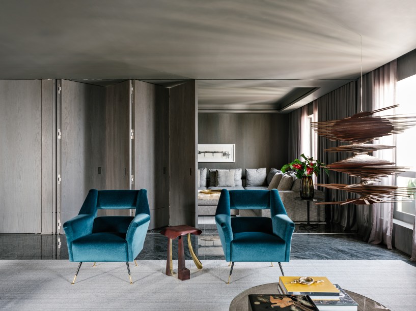 “Harmonizamos móveis de estilo mais clássico com móveis de estilo contemporâneo para compor a decoração. Na sala de estar, por exemplo, a cômoda e o trio de mesas laterais pretas com frisos dourados, da Kcase, e o par de poltronas estofadas em tecido aveludado azul remetem ao passado e foram estrategicamente inseridos como elementos de destaque”, diz o arquiteto.