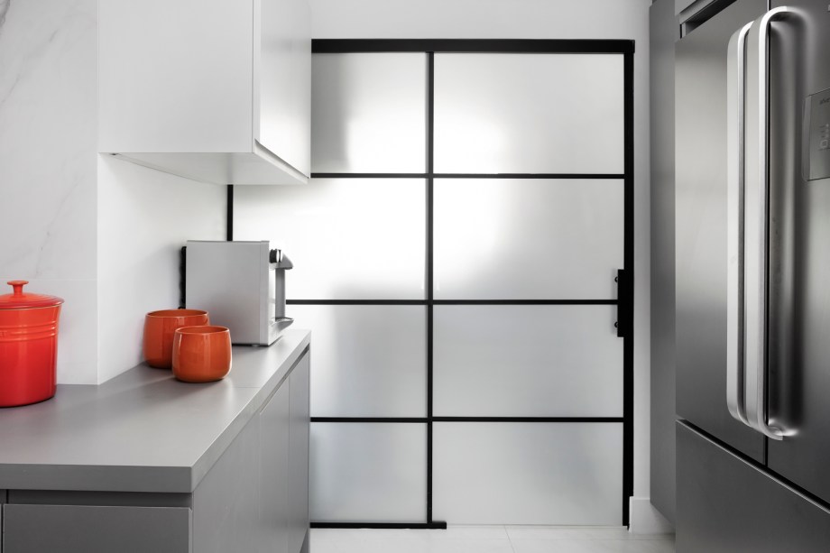 Painéis de correr em madeira foram instalados para permitir que a cozinha fique integrada ou isolada da área social.