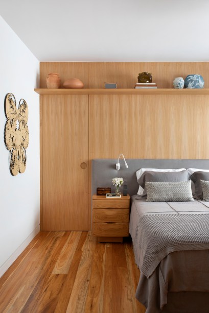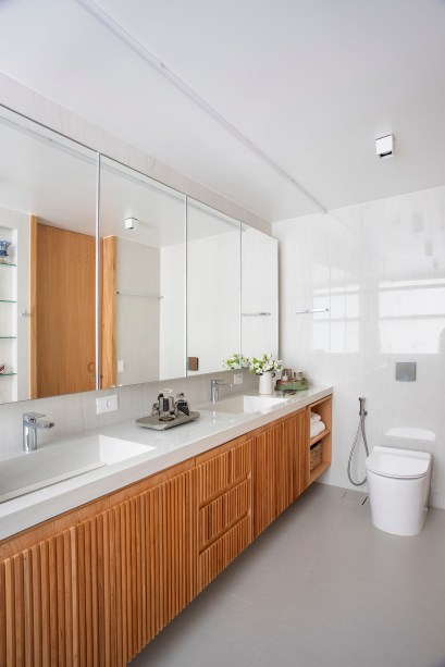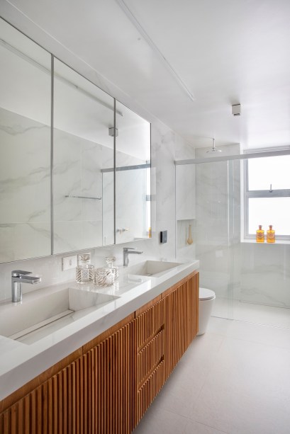 “Eles queriam ter muito espaço de armários, conforto para ver TV sozinhos ou com os netos, além de banheiros claros e clean, pois os antigos tinham materiais escuros. Eles também pediram ao escritório para encaixar no projeto duas adegas grandes que já possuíam”, conta Maurício.