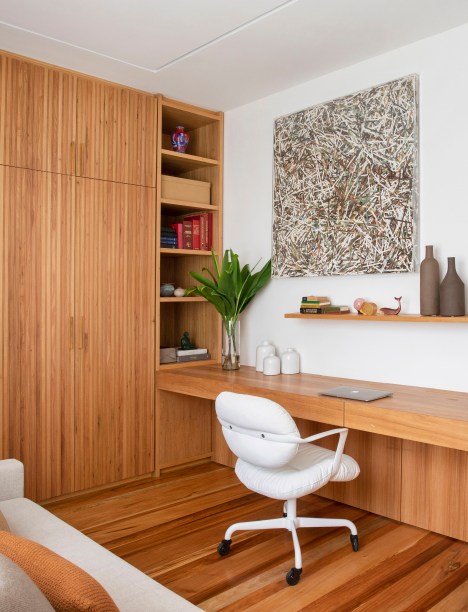Já os objetos, livros e obras de arte foram integralmente aproveitados do acervo da cliente, com direito a obras de artistas consagrados, como Abraham Palatnik, Frans Krajcberg, Chiara Banfi, Angelo Venosa, Daniel Senise e Gonçalo Ivo.