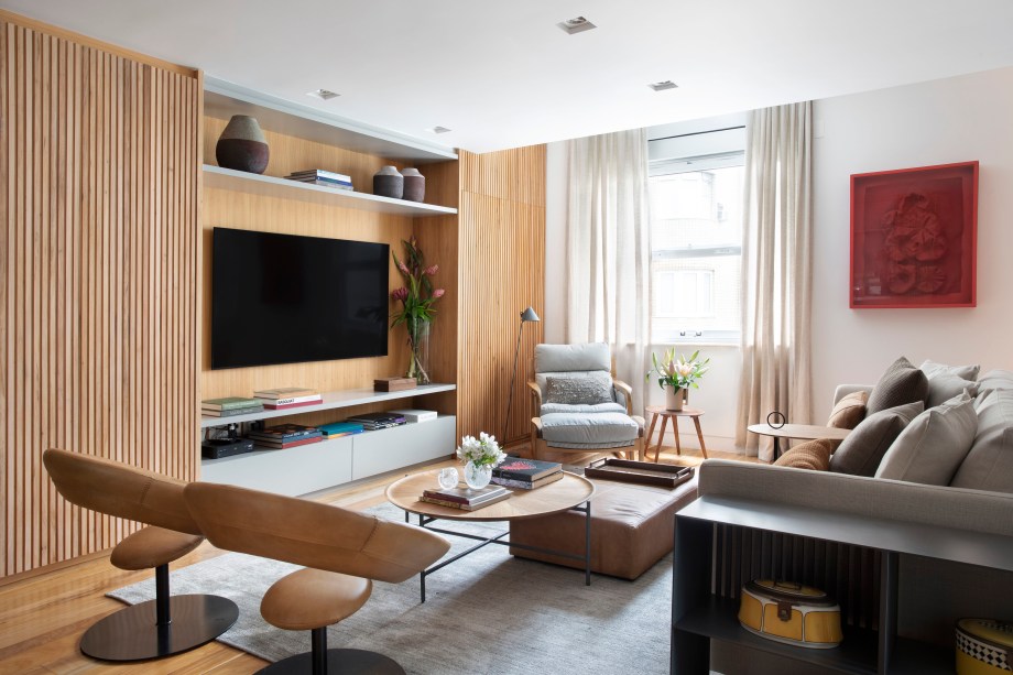 “Privilegiamos o mobiliário brasileiro contemporâneo, que é uma de nossas paixões. Destaque para a chaise Pitu, de Aristeu Pires, que é uma aula de ergonomia e conforto, e também para as poltronas Anel 80’s, de Ricardo Fasanello, icônicas do design brasileiro dos anos 80”, informa Alice.