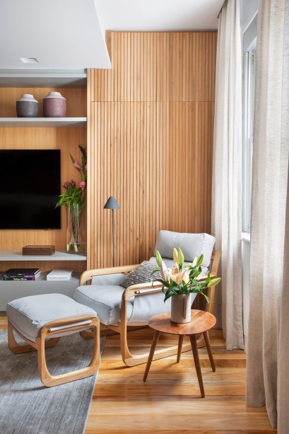 No que se refere à decoração, que segue um estilo brasileiro contemporâneo, elegante e relaxado ao mesmo tempo, praticamente todo o mobiliário é novo, à exceção da cadeira do escritório, que é peça de estimação do cliente.