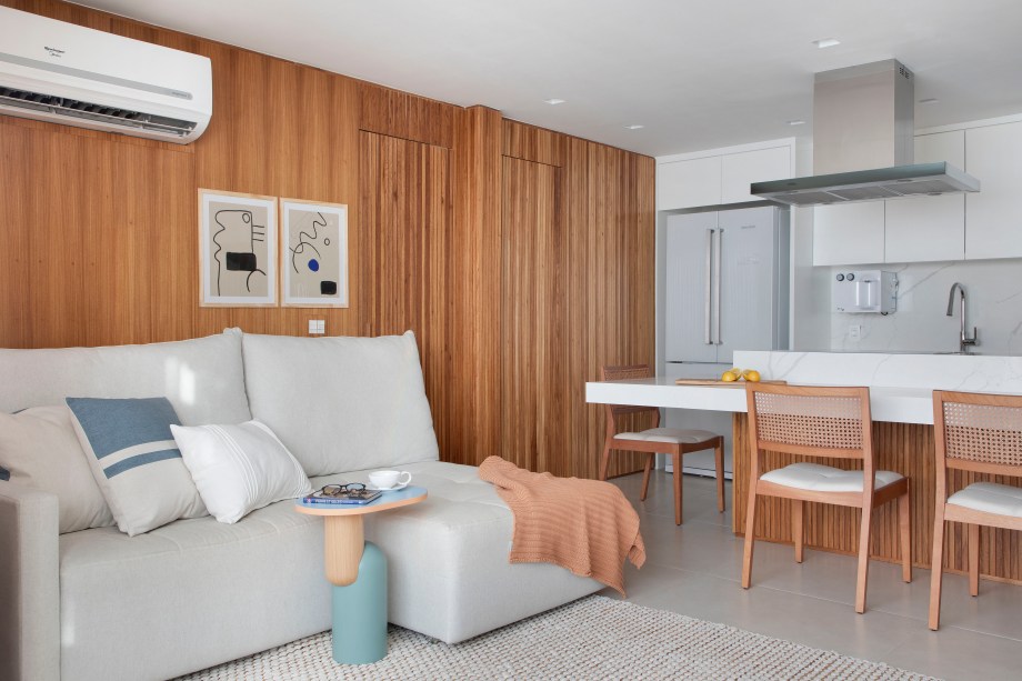 “Ao integrar a cozinha com a área social da casa, costumo optar por materiais mais claros e lançar mão de elementos que promovam a integração visual do espaço. Neste caso, usei o mesmo piso em tudo e o mesmo painel de marcenaria ripada para unir visualmente os dois ambientes”, acrescenta ela.