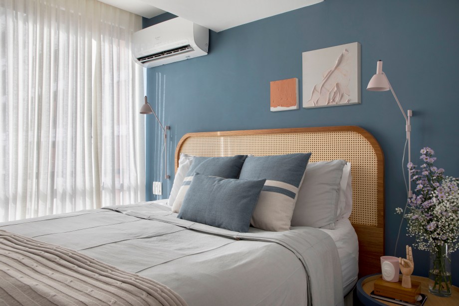 A parede azul no quarto da suíte master foi um pedido da própria cliente, por ser uma cor que a transmite paz. Já o outro quarto, como também funciona como escritório, o tom terroso da parede foi escolhido por deixar o ambiente mais neutro.