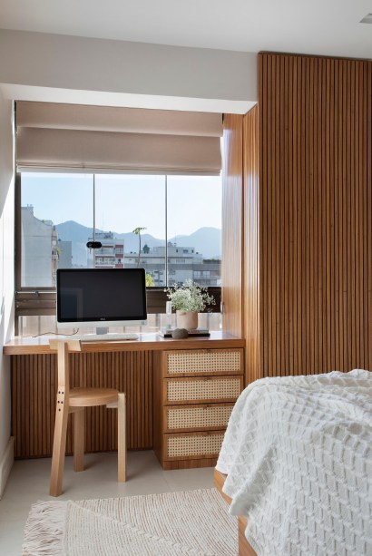 Nos dois quartos, a arquiteta integrou as respectivas varandas para deixá-los mais amplos e confortáveis. No caso da suíte máster, o ganho de espaço também permitiu aumentar consideravelmente o banheiro e ainda criar um closet que não existia na planta.