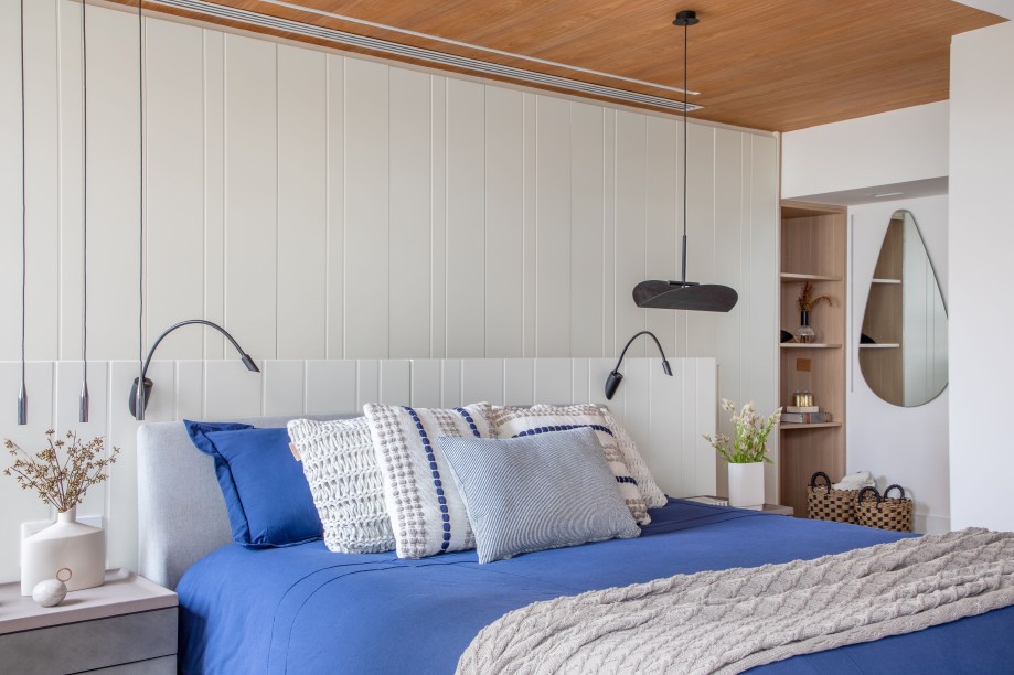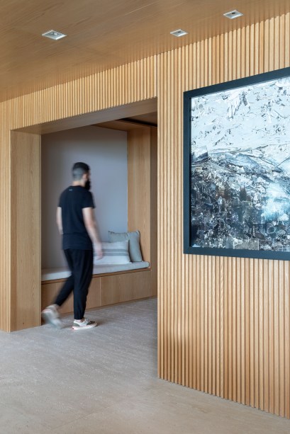 No geral, o projeto buscou criar um lar atemporal e aconchegante para a família, tendo como maior desafio preencher de forma inteligente os espaços amplos e integrados que compõem a área social. Para atender à solicitação por um espaço de coworking, surgiu a ideia de criar uma grande “caixa” camuflada no painel de madeira ripada da sala, com portas que abrem e fecham em sistema camarão, permitindo isolar completamente o espaço e o hall de entrada da sala, quando necessário.