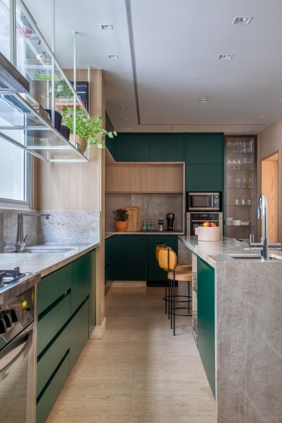“A paleta de cores foi inspirada em elementos naturais, a exemplo do verde que aparece tanto nas plantas como em parte da marcenaria da cozinha, o tom de areia presente nos mobiliários e no piso, a madeira que reveste a marcenaria, o couro caramelo e o tapete azul que remete ao mar”, avalia o arquiteto Thiago Morsch