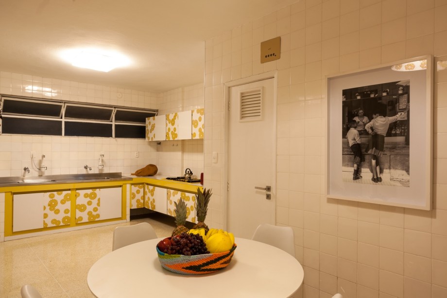 Na cozinha, a empresa do arquiteto restaurou a granilite, que era um hit da época e, recentemente, voltou à moda. Com armários da Kitchens, originais da década de 1960, o ambiente tem forno a gás e cooktop originais da marca, de quando eles produziam eletrodomésticos. Uma raridade que Felipe soube usar muito bem.
