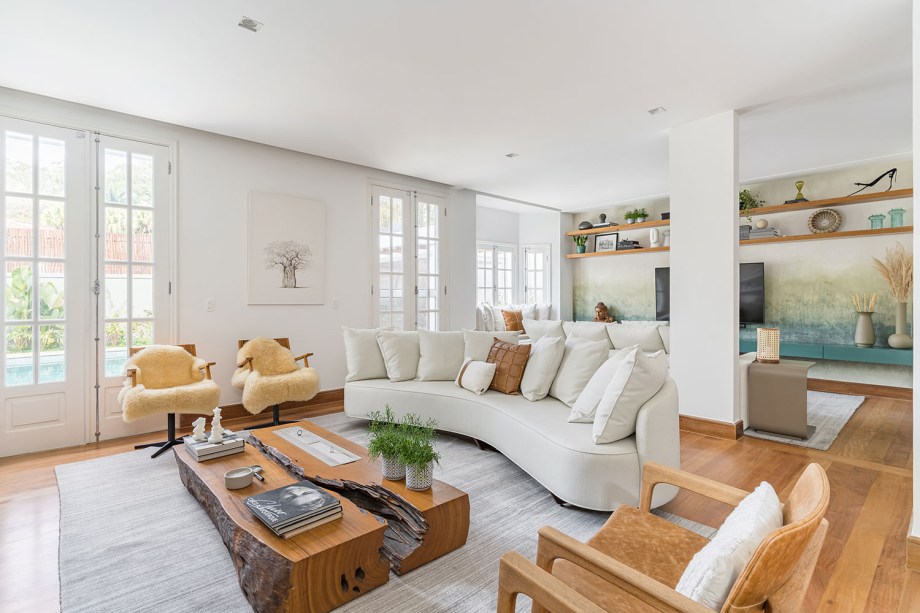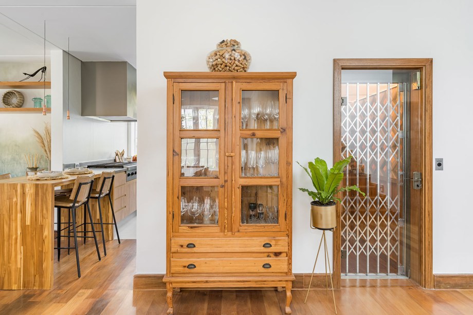 O piso original de assoalho na área social foi recuperado, assim como a estrutura original da madeira foi mantida – aqui só foi trocado o revestimento pela pedra Moledo.