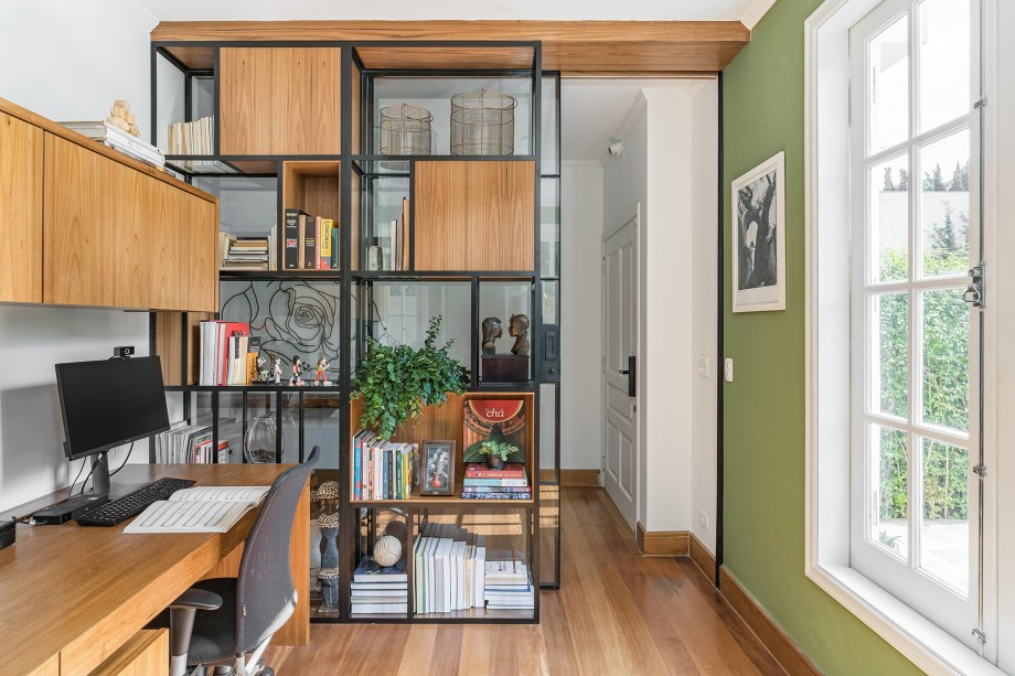 O home office ganhou uma área relativamente integrada, com uma estante fechada com vidro, que traz isolamento acústico, mas que privilegia a integração e a acústica do espaço. O espaço fica logo na entrada da casa, ao lado do hall com elevador.