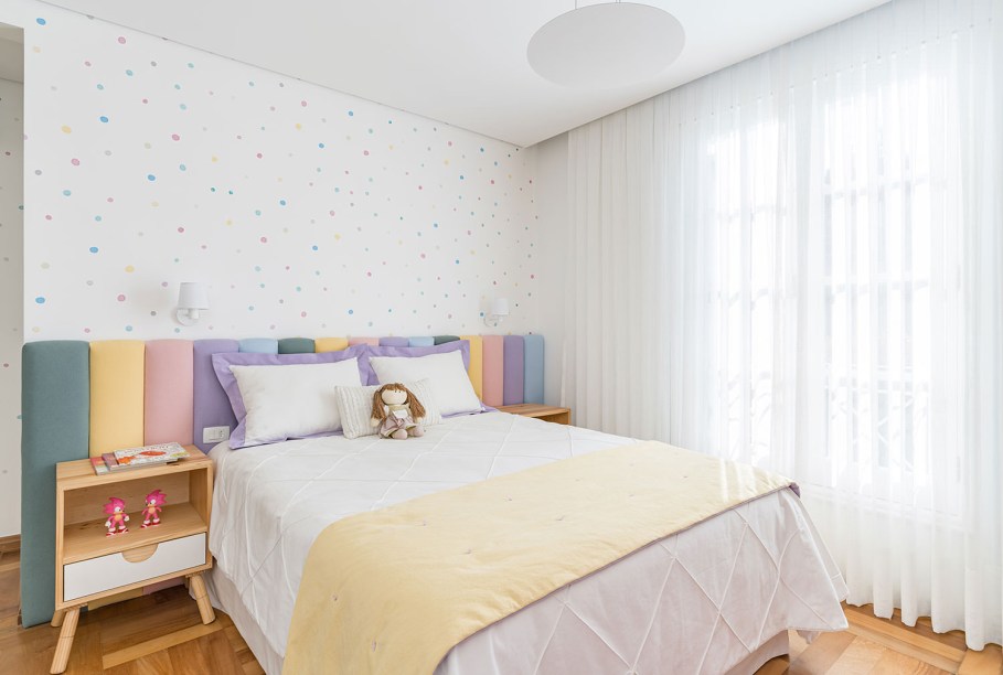 O quarto das crianças trouxe personalidade com papéis de parede e marcenaria coloridos, garantindo um toque lúdico, sem deixar a funcionalidade de lado. A bancada de estudos possui bastante espaço para armazenamento.
