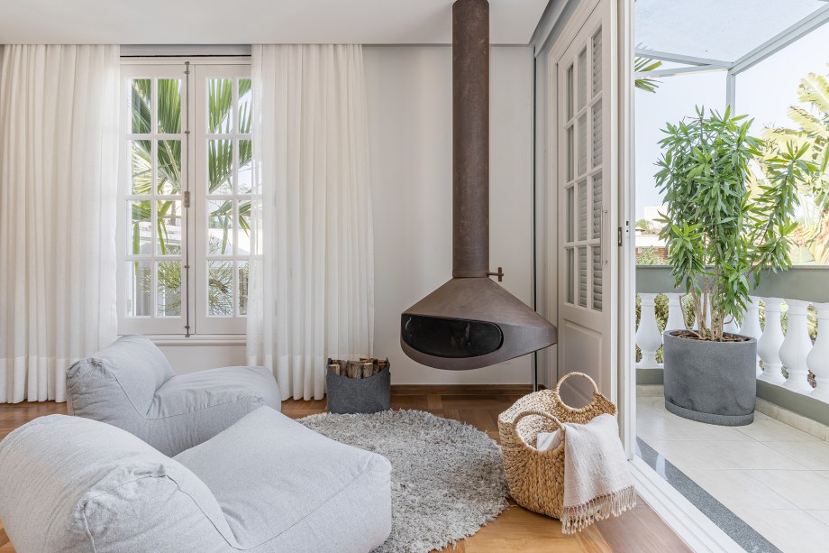 Para a área íntima, os quartos possuíam uma metragem generosa, o que permitiu compor ambientes ainda mais confortáveis. Para a suíte, a arquiteta apostou em tons claros e a madeira como base. Além do espaço da cama, criou um espaço íntimo para o casal, com uma lareira suspensa e pufes.