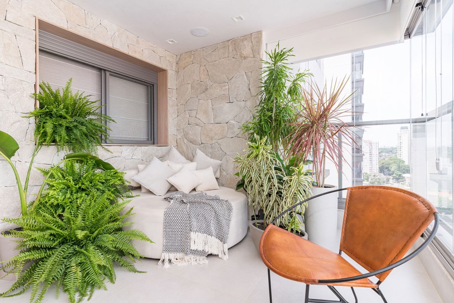 A chaise abraçada por plantas foi pensada para apreciar o ponto alto da vista do imóvel: o pôr do sol. “O prédio é cercado por muito verde e edificações térreas, o que permite ventilação constante. A luz natural é abundante em todos os ambientes”, conta Daniela.
