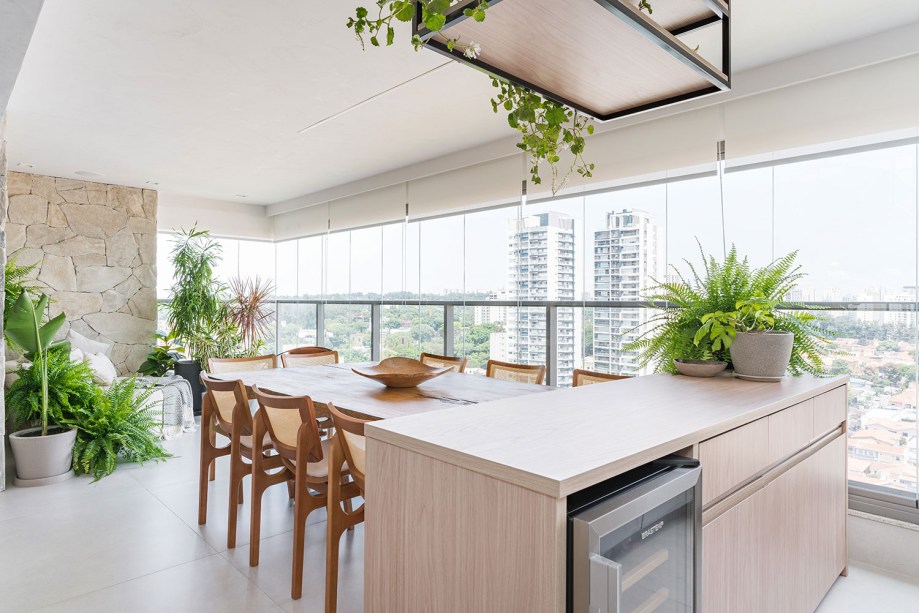 Neste mesmo ambiente integrado, a varanda recepciona amigos e moradores com uma mesa de madeira bruta certificada. Como ele é português; e ela, gaúcha, o casal adora receber amigos para um churrasco nos finais de semana.