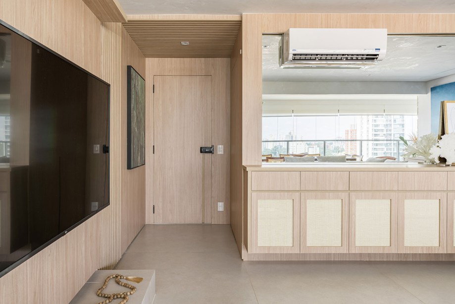 A marcenaria do móvel principal da sala abriga uma generosa sapateira, gavetas para correspondências e um espaço de rack – toda fiação de home theater foi escondida para deixar o painel de TV bem clean. “Somente depois das funções estabelecidas, pensamos em usar a palha indiana para compor o ambiente em estética”, conta Daniela.