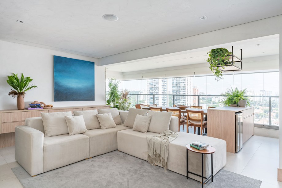 O primeiro passo foi a alteração da configuração do layout, integrando varanda e cozinha ao living: assim que se entra no estar, é impossível não reparar no quadro azul que pontua o décor com frescor e lembranças do mar. A obra foi feita pela própria arquiteta como presente de casamento para os moradores.