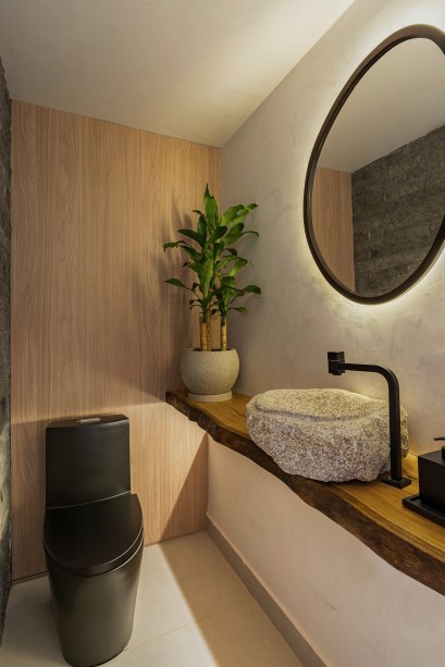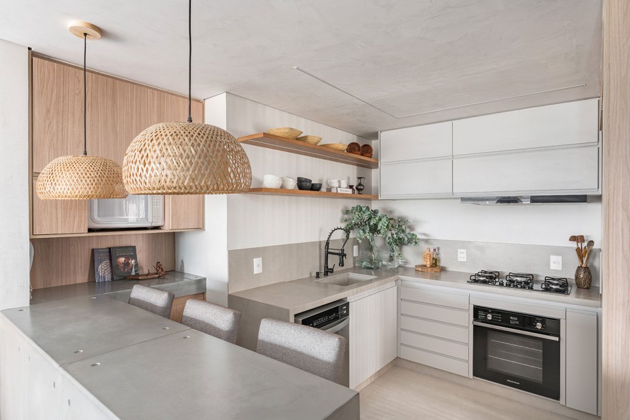 No décor, a paleta de cores clara mistura cimento queimado com tons off white focando no aconchego. Para dar um ar mais praiano, há diversos materiais naturais, como palha e madeira. “Todos as madeiras e pedras possuem selos de extração sustentável e certificação eco-friendly”, pontua a profissional.