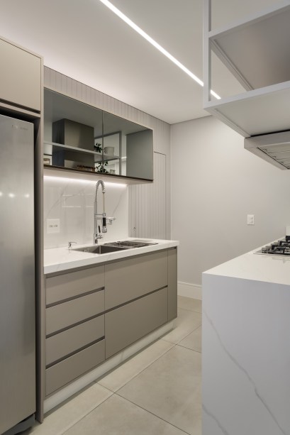 Na cozinha o pedido era por um grill, além do cooktop. Para conseguir suprir esta necessidade, a ilha comporta os eletrodomésticos e uma grande coifa feita sob medida – o aparelho foi escondido num móvel aéreo para não se tornar um elemento de foco.