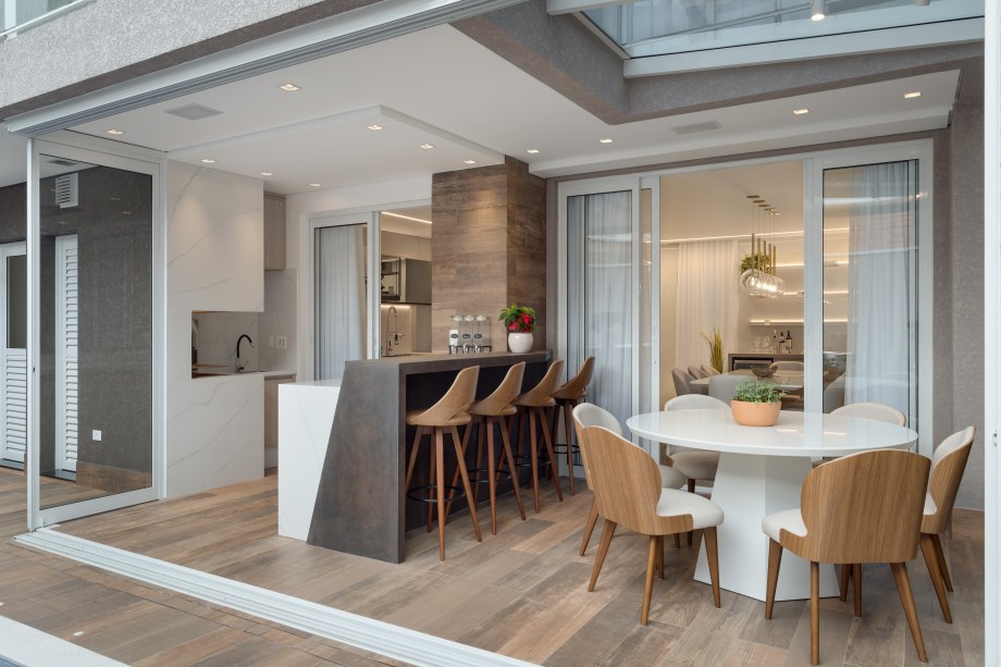 A parte externa recebeu uma grande transformação: como anteriormente o espaço era todo aberto, o escritório fez uma ampliação com cobertura de vidro para a área gourmet, onde foram mesclados materiais que foram utilizados na parte interna com materiais mais escuros para dar uma quebrada no clássico e trazer um pouco do aconchego.