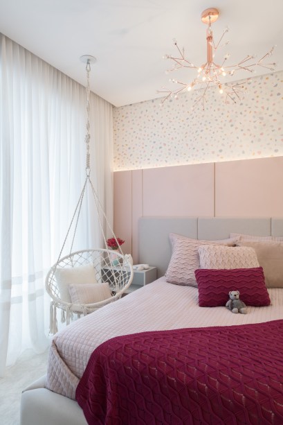 Na área íntima da casa há um home office, quarto de visitas, suíte da filha e suíte do casal. Todos esses ambientes seguem o estilo do resto da casa, com a mesma paleta de cores.