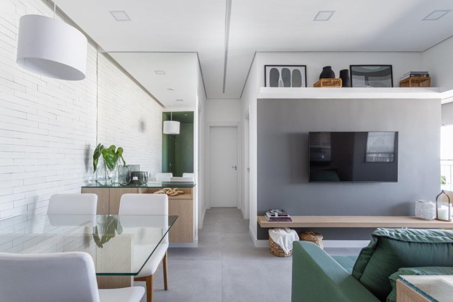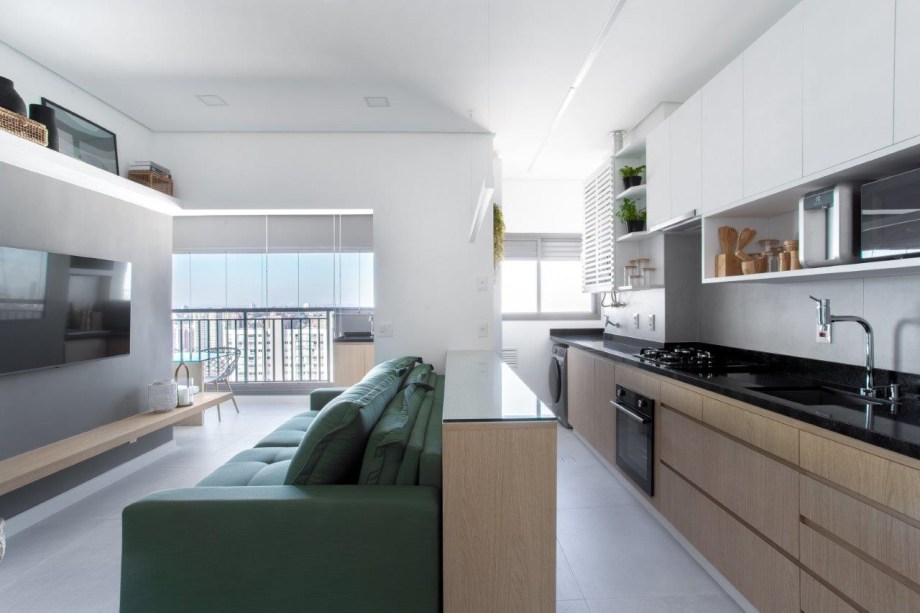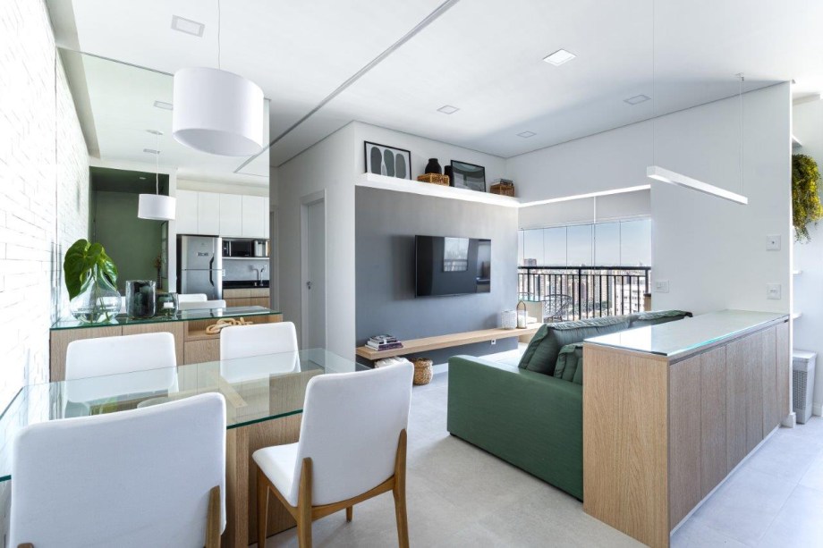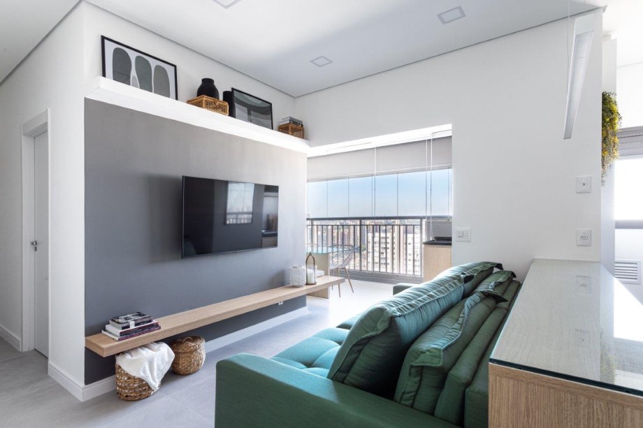 Sofá retrátil verde é destaque na sala de estar deste apartamento de 67 m²