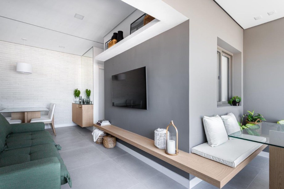 Então a arquiteta optou por fazer um banco em L que pega a sala e a varanda, e tem função visual, decorativa na parte interna e banco com futon na parte externa.