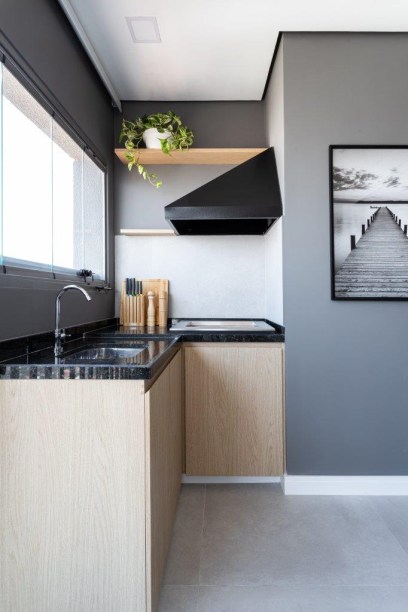O primeiro passo foi integrar toda a área social, retirando a parede entre a cozinha e a sala, a porta da lavanderia e a esquadria da varanda. Mesmo não tendo o hábito de receber visitas, queria que o espaço oferecesse conforto aos amigos de uma forma mais flexível.