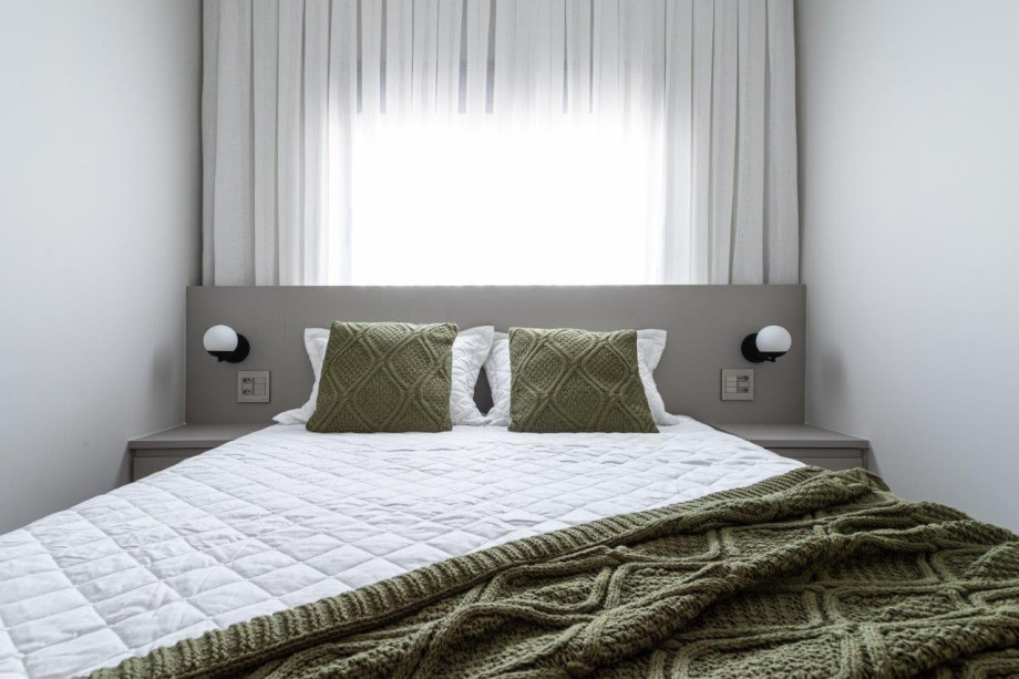 A arquiteta então teve a ideia de acomodá-la com uma cabeceira de 15 cm de largura na parede da janela, que além de proporcionar uma estética mais bonita e favorecer a circulação, ainda abrigou a cortina que desce um pouco abaixo da altura da cabeceira, facilitando sua abertura com praticidade e elegância.