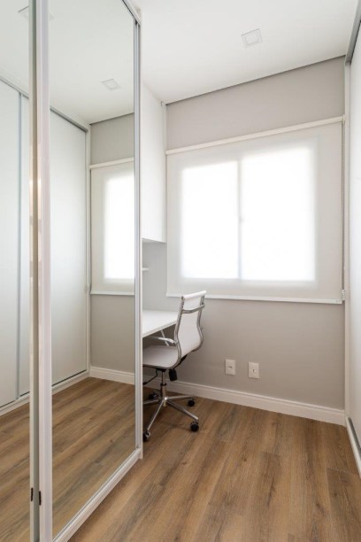 Como o apartamento possui dois quartos, um deles foi transformado em um closet e abrigou um canto para o home office. O outro quarto teve que ser pensado estrategicamente para receber a cama do cliente, já que a posição sugerida pela construtora não favorecia o espaço, deixando-o muito estreito na circulação.