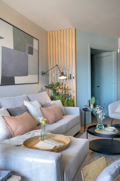 A sala de estar mescla paredes azuis e cinzas e possui uma chaise-longue. Na parede lateral do sofá, algumas ripas de madeira sobre um espelho dão relevo e luz à parede.