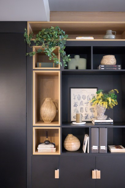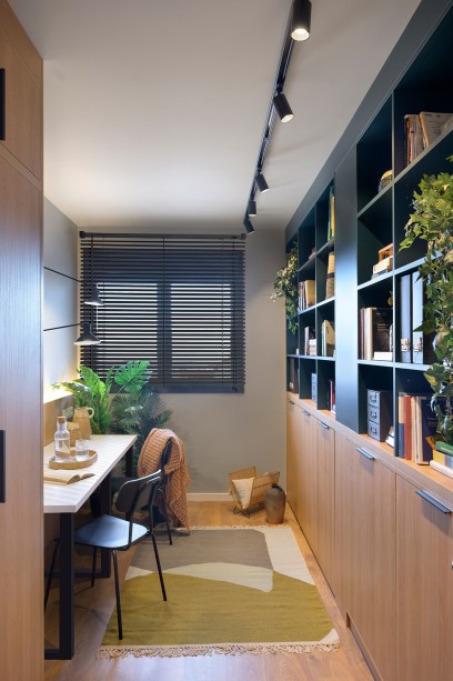 A marcenaria preta da TV abriga objetos em nichos iluminados. No painel está camuflada a porta de acesso à área íntima.