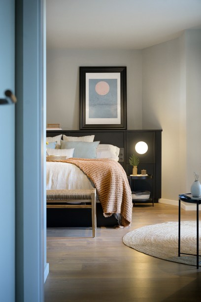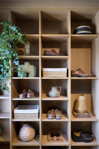 Já no quarto principal, a meia parede azul confere relevo, cor e forma a todo o ambiente e também serve como prateleira e superfície para as luzes de cabeceira. O closet ganhou marcenaria que acompanha o layout irregular e um banco baú abaixo da janela.