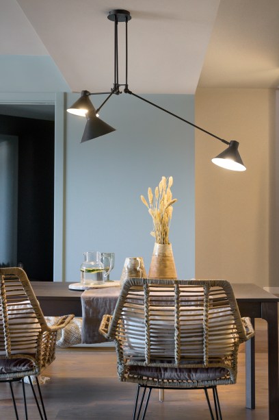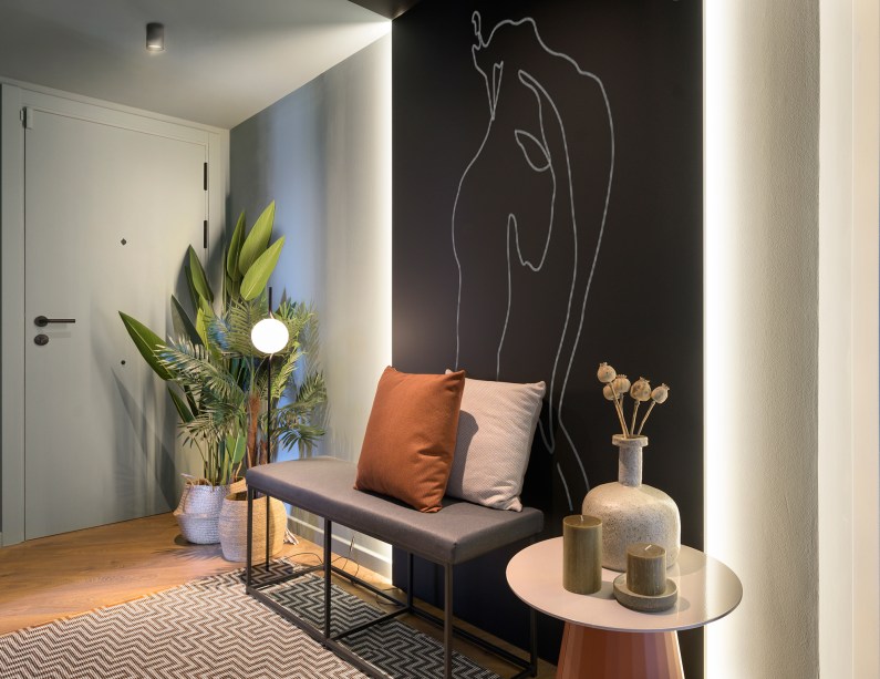 Na paleta de cores, os tons terrosos, azul celeste e preto se distribuem pelos ambientes criando contrastes (quentes e frios) e servem como fio condutor em toda a casa. Destaque para grande pintura preta retroiluminada localizada logo na entrada.