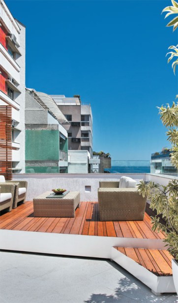 Depois da reforma, o terraço na cobertura do prédio ganhou uma sala de estar integrada ao deck de madeira e um belo gramado, que serve como telhado verde