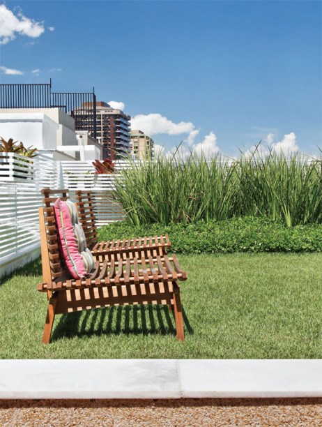 Depois da reforma, o terraço na cobertura do prédio ganhou uma sala de estar integrada ao deck de madeira e um belo gramado, que serve como telhado verde