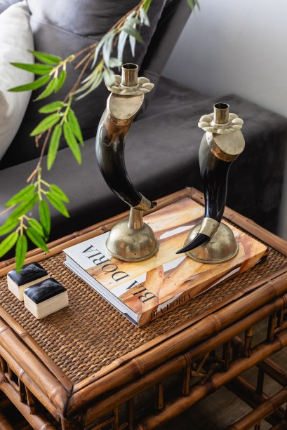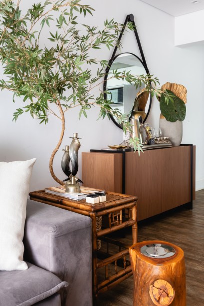 O sofá cinza não foge em nada a proposta do apartamento e dispõe de um degradê de texturas e cores nas almofadas. Além disso, as banquetas de prata adornadas de arabescos indianos e o tapete de pele de vaca acrescentam um toque diferente e, ao mesmo tempo, marcante. “Escolhemos peças que são práticas para o dia a dia e de fácil manutenção.