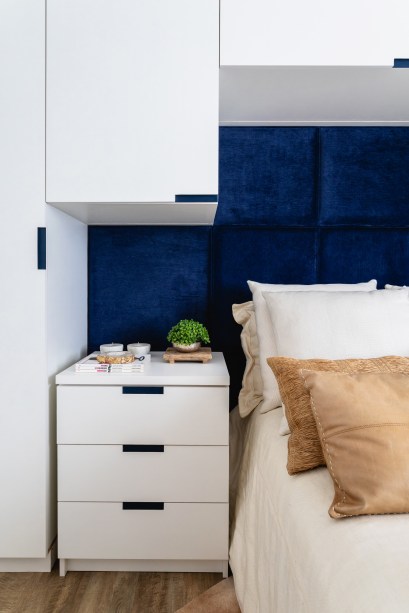 No dormitório, a marcenaria branca se estende por todas as paredes e, além de funcional, ajudou a ampliar o ambiente. O azul marinho na cabeceira, feito em placas de espuma pespontadas e revestidas em tecido à base de algodão, acrescenta tranquilidade, serenidade e estabilidade. “Escolhemos o tom com a ideia de contraste e a continuidade da proposta jovial, que de forma alguma pesou no ambiente”, analisa Eduardo.