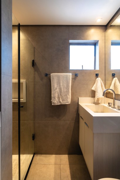 O banheiro foi reformado por completo com a intenção de alongar o box, uma vez que na planta original o ambiente era demasiadamente pequeno e desconfortável. Na proposta, o porcelanato com efeito amadeirado patinado deixou a ambientação ainda mais receptiva.