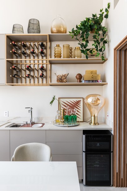 No décor, foi utilizada uma paleta de tons claros e neutros com alguns detalhes no amadeirado e dourado, que se sobressaem no ambiente principal.