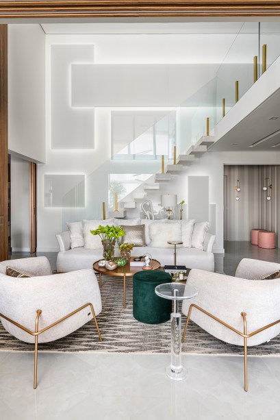 A maior solicitação era o mezanino no living para o espaço de home office. “Optamos por elaborar esse espaço em estrutura metálica, tanto para a escada quanto para o mezanino. A escada foi revestida em porcelanato e no mezanino usamos o piso vinílico“, conta a profissional.