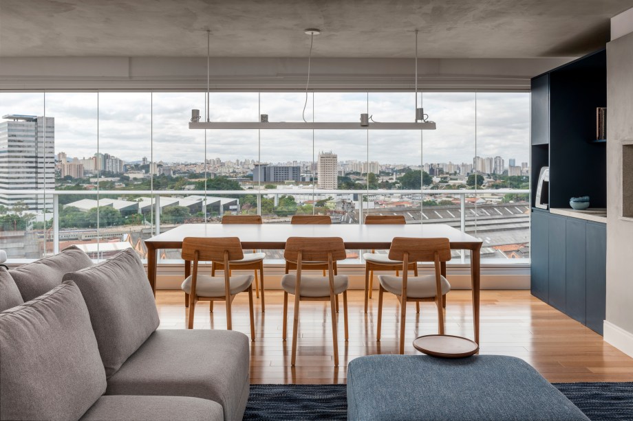 A primeira intervenção foi a integração da cozinha, derrubando a parede que a separava do restante do ambiente. A segunda intervenção foi retirar os caixilhos da varanda, onde foi criada a nova sala de jantar.