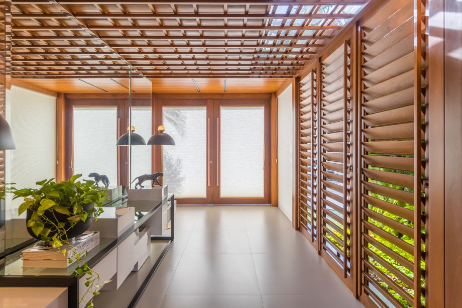 Destaca-se no projeto é o charme da entrada da casa, repleta de painéis articuláveis de madeira em suas laterais e no forro, mesclando um padrão de ripas de madeira e vidro, trazendo o balanço das folhas da palmeira para dentro da casa.