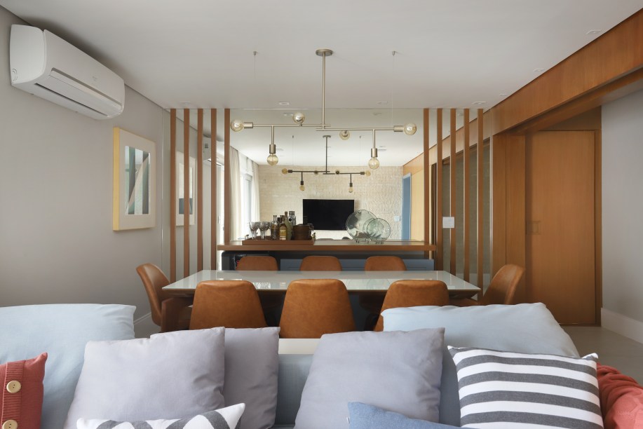 Na sala de estar integrado com o jantar, o destaque é para a parede de tijolinhos – um pedido dos moradores. A parede oposta foi inteirinha revestida de espelhos, mas o que chama atenção é o acabamento com ripas de madeira que dão estilo ao ambiente, enquanto cobrem as emendas das peças.
